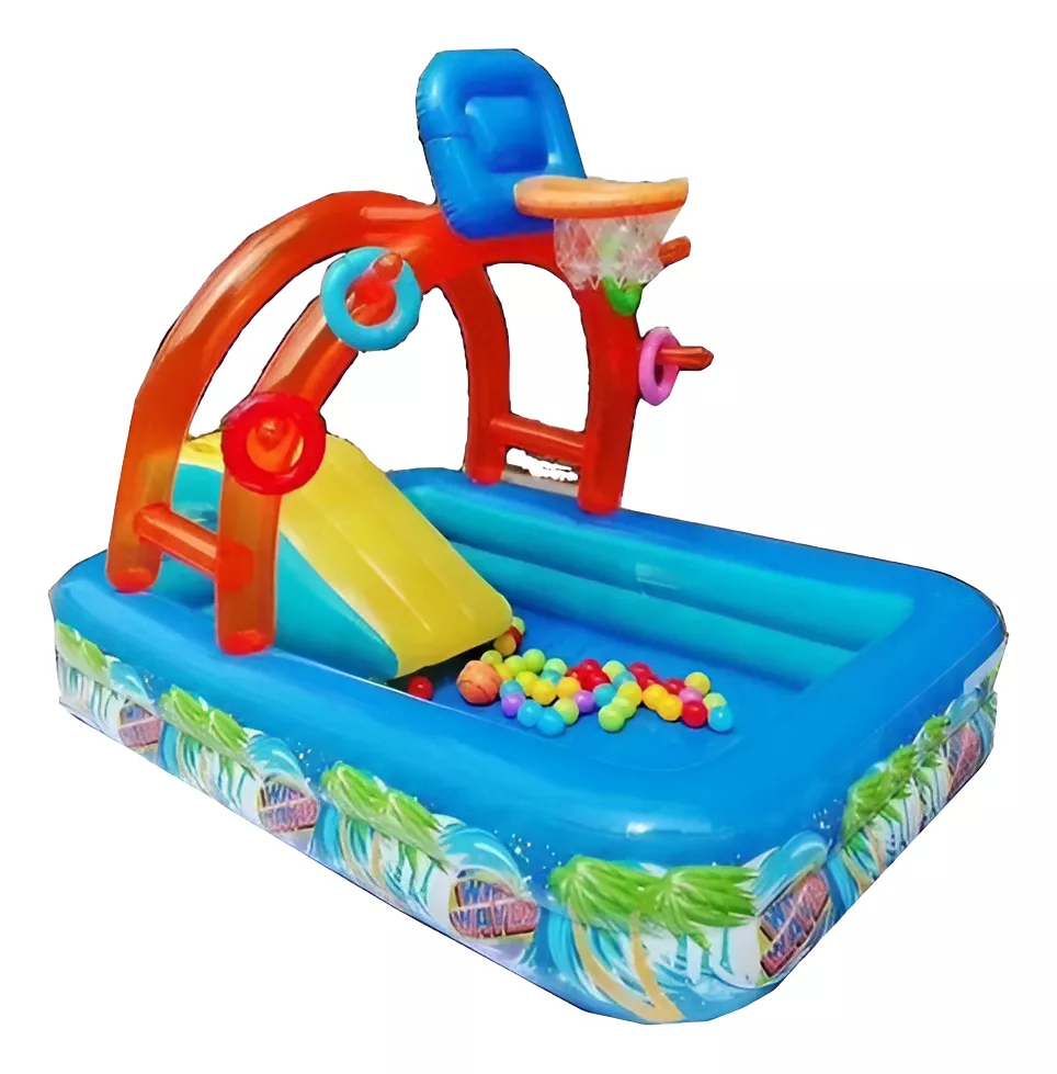 Hermosa piscina PARQUE ACUATICO CON TOBOGA , BASQUET Y LANZAMIENTO DE AROS. IDEAL PARA TODA LA FAMILIA Material : PVC resistente Medidas: PISCINA: 188CM DE LARGO / 137 CM DE ANCHO / 34CM PROFUNDIDAD TOBOGAN: 122 CM X 53CM X 53CM Recomendado para niños MAYORES DE 2 AÑOS